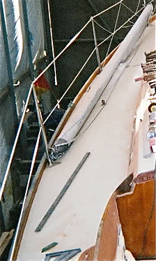 | Vang: The effectiveness of the vang can be improved somewhat by rivetting the fitting on the mast as low as possible above deck back to the mast. This way the initial arrangement can be improved by about 4“.