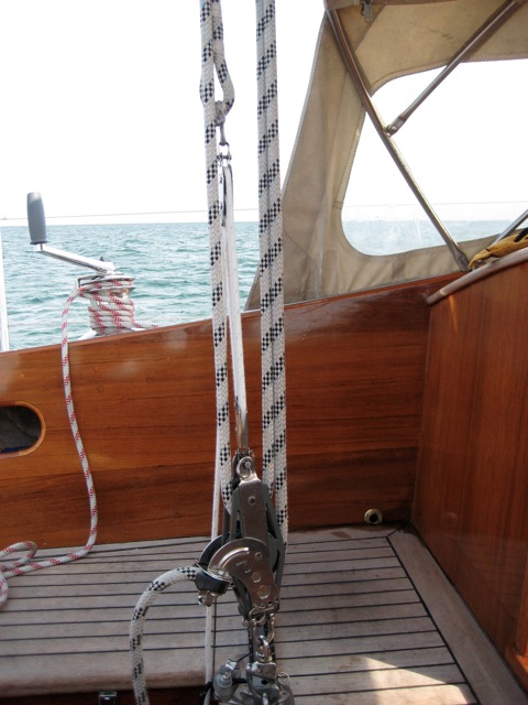Given that none of the arrangements for the traveller is perfect the load of the main sheet can be significant. This may be eased by sheeting the main sheet 6-fold as above, however this then will result in a long and heavy sheet for the main which may not work well in light airs. A 4-fold arrangement may be too hard to work for small crews. A simple 4-fold sheet arrangement may be used however by adding a 4-fold fine adjustment into the middle. See the picture attached. This arrangement allows perfect control of the sheets under virtually any wind speed and still leaves the main sheet light.